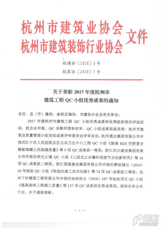 2017年度杭州市建筑工程QC小組優秀成果二等獎